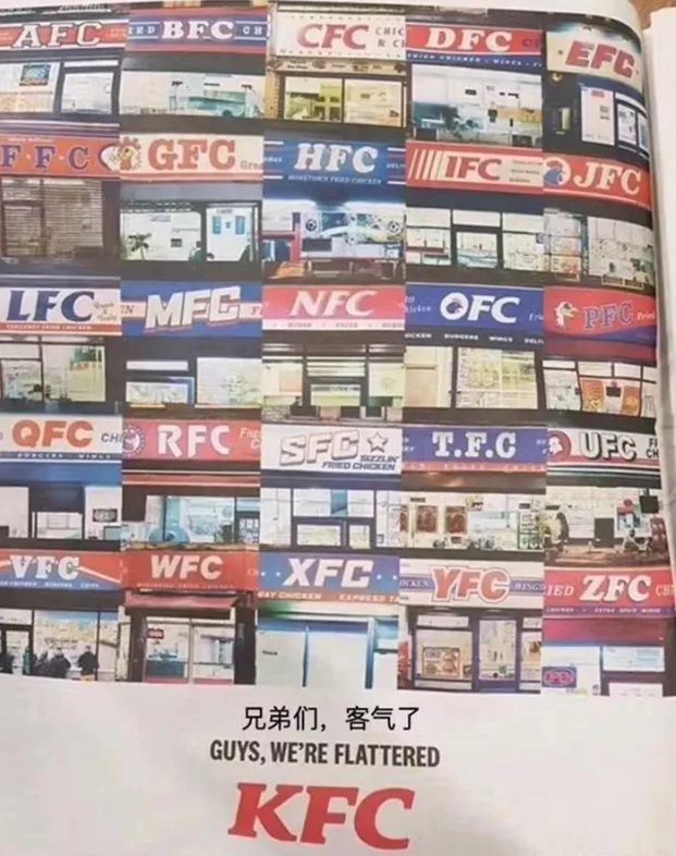 最夸张的是这些年KFC的山寨品牌们……已经凑齐一整个字母表了。但是像这次的跨界碰瓷,一次多个的,还是第一回。国人的脑袋瓜,真是聪敏的一塌糊涂。